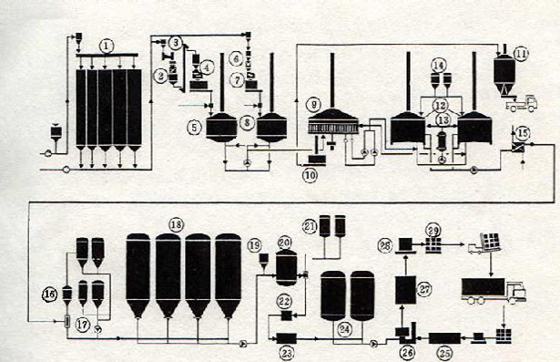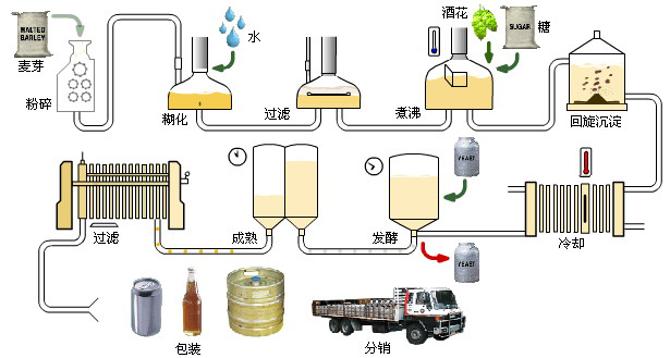 1、原料贮仓 2、麦芽筛选机 3、提升机 4、麦芽粉碎机 5、糖化锅 6、大米筛选机 7、大米粉碎机 8、糊化锅 9、过滤槽 10、麦糟输送 11、麦糟贮罐 12、煮沸锅/回旋槽 13、外加热器 14、酒花添加罐 15、麦汁冷却器 16、空气过滤器 17、酵母培养及添加罐 18、发酵罐 19、啤酒稳定剂添加罐 20、缓冲罐 21、硅藻土添加罐 22、硅藻土过滤机 23、啤酒精滤机 24、清酒罐 25、洗瓶机 26、灌装机 27、杀菌机 28、贴标机 29、装箱机