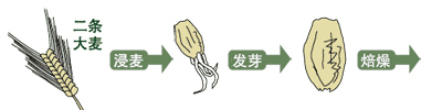 大麦必须通过发芽过程将内含的难溶性淀料转变为用于酿造工序的可溶性糖类。大麦在收获后先贮存2-3月,才能进入麦芽车间开始制造麦芽。为了得到干净、一致的优良麦芽,制麦前,大麦需先经风选或筛选除杂,永磁筒去铁,比重去石机除石,精选机分级。制麦的主要过程为:大麦进入浸麦槽洗麦、吸水后,进入发芽箱发芽,成为绿麦芽。绿麦芽进入干燥塔/炉烘干,经除根机去根,制成成品麦芽。从大麦到制成麦芽需要10天左右时间。