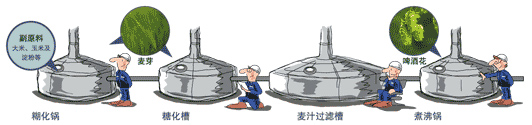 糊化锅:首先将一部分麦芽、大米、玉米及淀粉等辅料放入糊化锅中煮沸。糖化槽:往剩余的麦芽中加入适当的温水,并加入在糊化锅中煮沸过的辅料。此时,液体中的淀粉将转变成麦芽糖。麦汁过滤槽:将糖化槽中的原浆过滤后,即得到透明的麦汁(糖浆)。煮沸锅:向麦汁中加入啤酒花并煮沸,散发出啤酒特有的芳香与苦味。