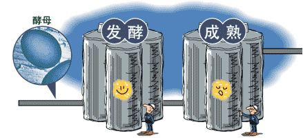 发酵罐成熟罐:在冷却的麦汁中加入啤酒酵母使其发酵。麦汁中的糖分分解为酒精和二氧化碳,大约一星期后,即可生成"嫩啤酒",然后再经过几十天使其成熟。